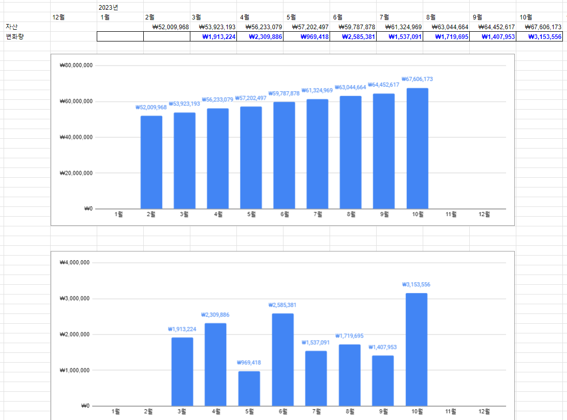 처음 취직한지 1년되었을 때 모은 돈이 1000만원정도였는데 총 자산이 거의 6배가되었네요.