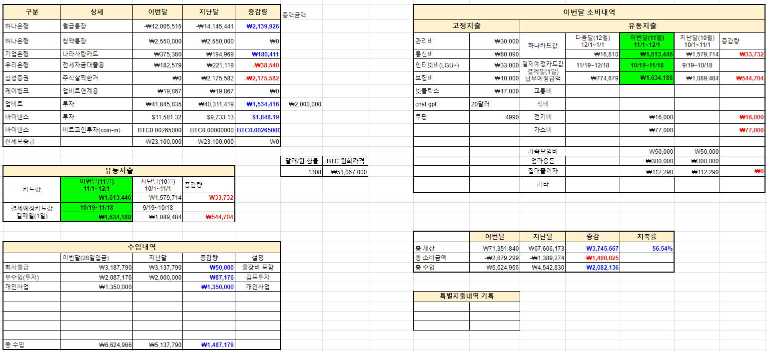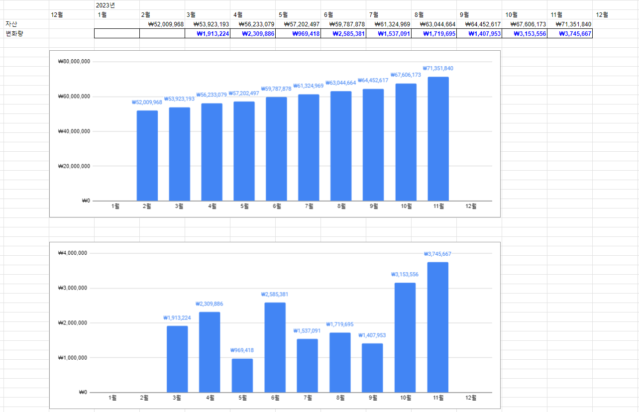 환율이 지난달에 비해 50원가까이 떨어졌음에도 투자는 성공적이었습니다. 10월, 11월에 유동성이 많아서 웬만한 알바비용보다 더 벌었습니다. 자산변화량도 최고치를 갱신했구요.