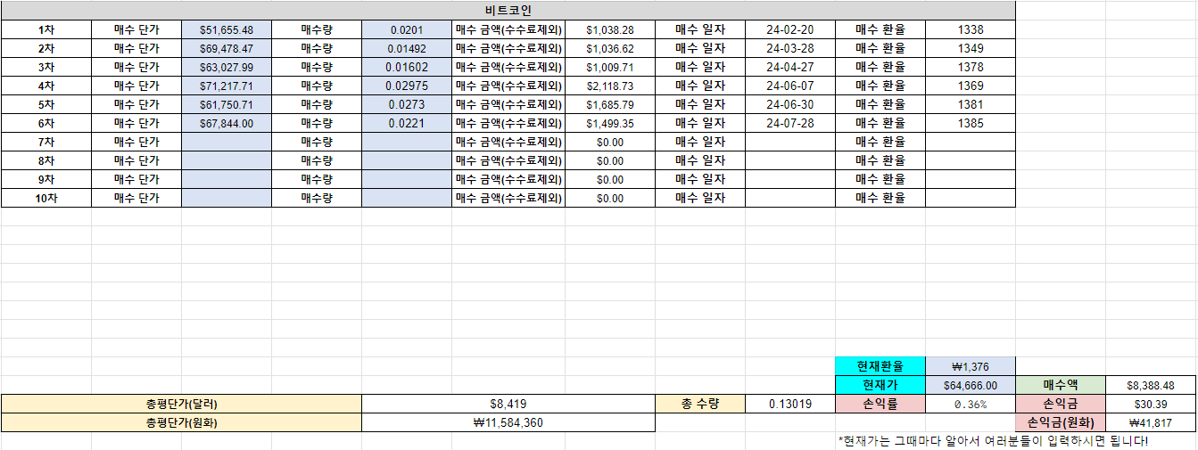 비트코인도 6차 DCA입니다. 어째 기분탓인지는 모르겠는데 꼭 제가 매수하고나서 가격이 떨어지는 거 같아요. 장기적으로 보면 거기서 거기겠지만 기분이 몹시 나쁩니다.