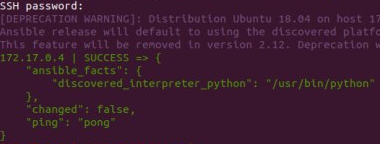 | 172.17.0.4 | UNREACHABLE! => { "changed": false, "msg": "Failed to connect to the host via ssh: ssh: connect to host 172.17.0.4 port 22: Connection refused", "unreachable": true } |