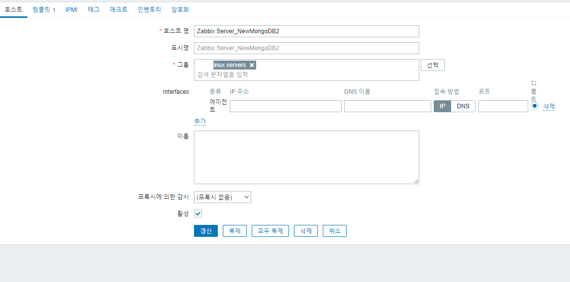 Zabbix 서버 호스트를 편집하는데 이 때 인터페이스 에이전트 IP address를 172.17.0.6 위에 Docker inspect 명령어로 얻은 IP를 입력해줍니다. 포트는 10050 입니다.