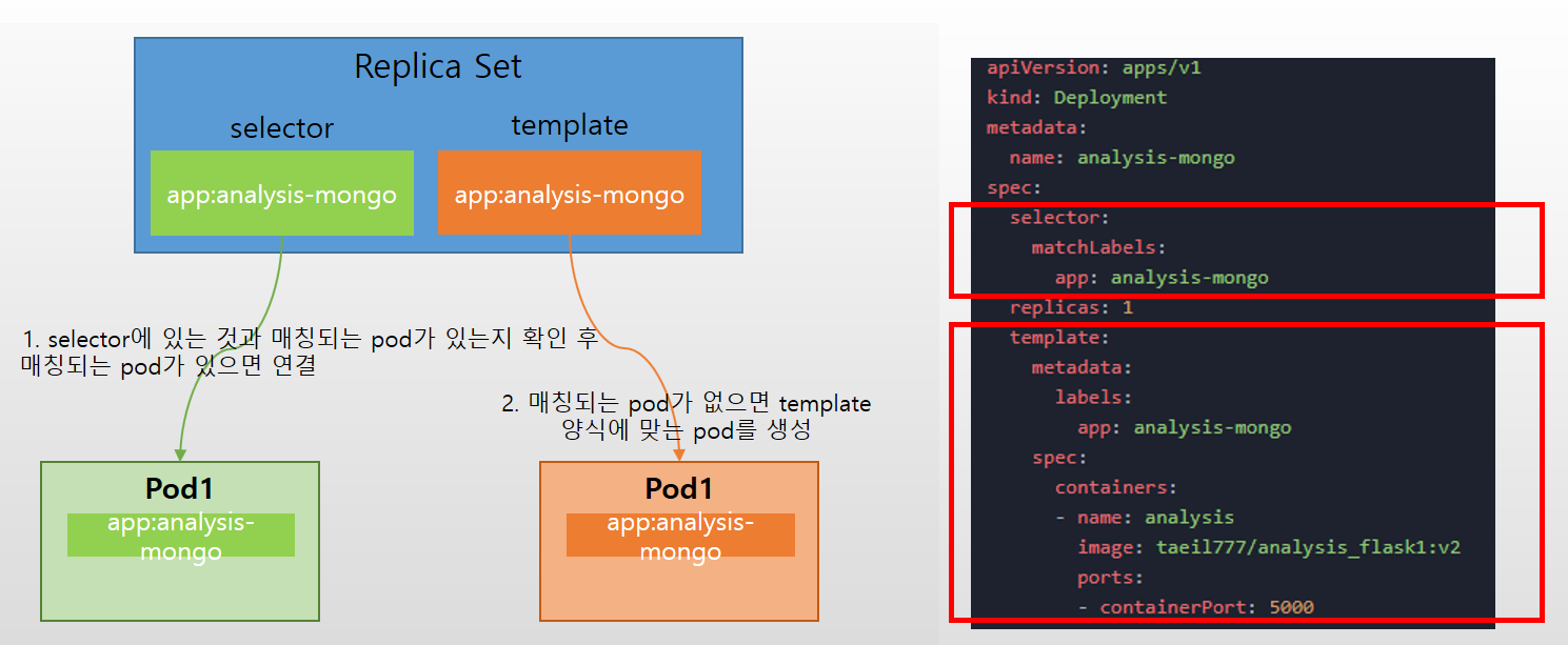 Replica Set의 간단한 설명을 그리면 위와 같은데 오른쪽의 yaml파일의 내용을 보게 되면 selector와 template가 있다.